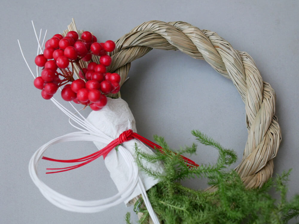 サイドにバランスよくデザインされた丸型のしめ縄が特徴的な「ラウンド」。赤い南天と緑色のヒカゲカズラの配色が際立っています。