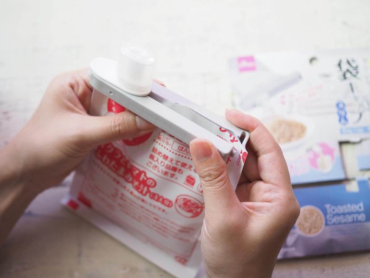 続いてご紹介するのは、食品袋に付けるだけで便利なキャップ付き袋に変身する「袋キャップスリム」です。