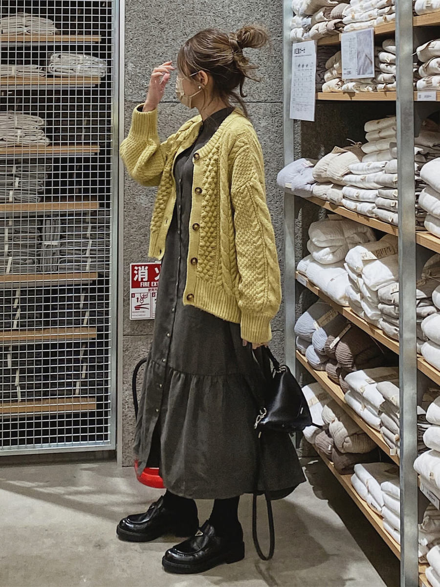 カーディガンのボタンを閉めると、かわいらしさアップ。