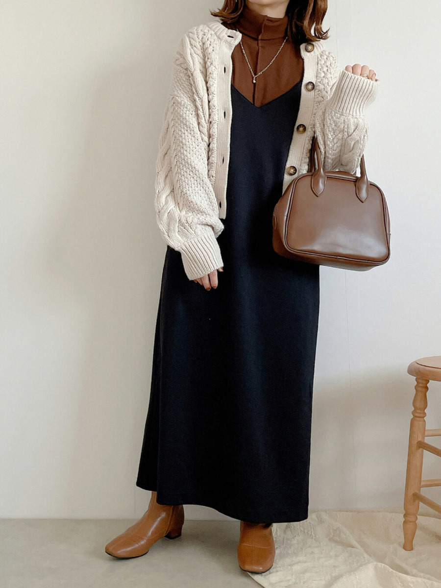 ナチュラル×ブラウンのタートルネックニット×黒キャミワンピ