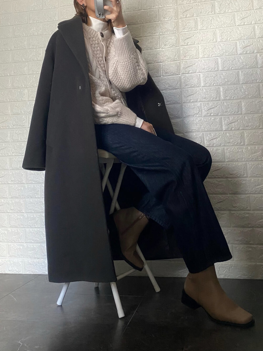 雰囲気のあるコクーンシルエットは、スキニーより少しゆとりのあるパンツにするとこなれた印象に仕上がります。