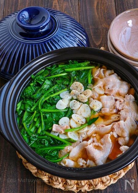 ビタミンと鉄分がたくさん摂れる栄養たっぷりの鍋。旬のほうれん草は甘みとうま味が濃いので、鍋料理でおいしく楽しむことができます。にんにく入りで風味が良く、体もぽかぽかに。
