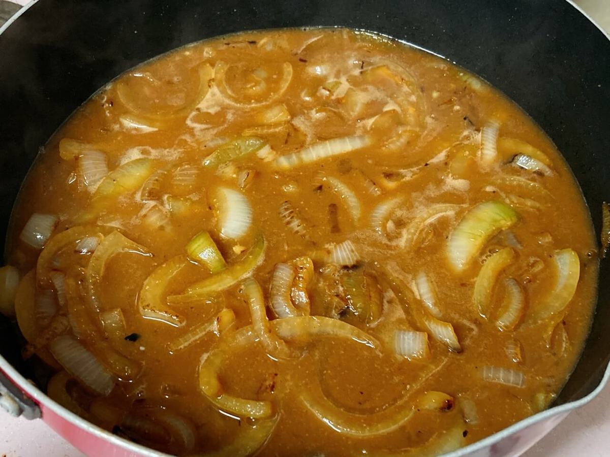 ③炒めた玉ねぎにタレと水(100ml)を加え、煮立たせたら火を止める