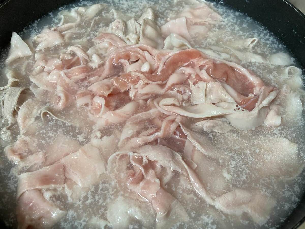 沸騰したお湯の温度を下げ、サッと茹でることで豚肉の余分な脂と臭みが落ち、固くなるのを防ぎます