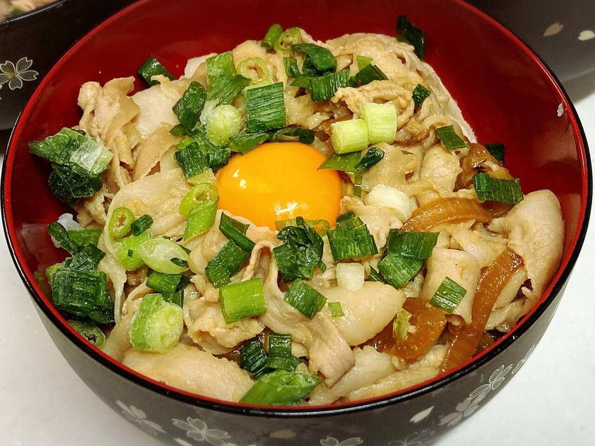 ⑤ご飯を丼に盛り付け、豚肉を③のタレに絡めてご飯に盛ったら、卵黄をのせ、小ネギを散らして完成!