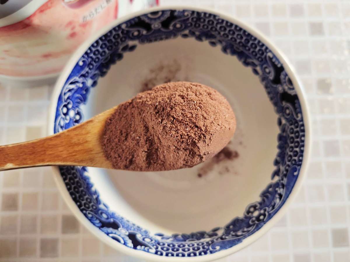 ココアラテ約20gに、ホットミルクで作るなら約120ml、お湯なら約100m、アイスにする時は冷たい牛乳や水約100mlを入れます。