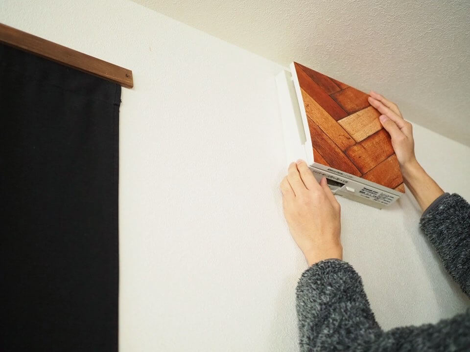 続いて、白一色のシンプルな排気口カバーを木目シートでリメイクしました。