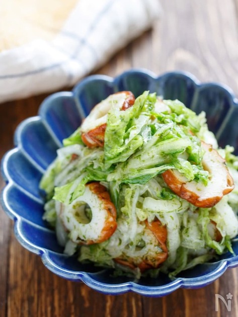 磯の香りをふんわりまとった生白菜がおいしい作り置きナムル。ちくわ入りなので、食感の違いも楽しめます。味付けは、シンプルなにんにく塩味。白菜のうま味を堪能できる一品です。冷蔵で2~3日ほど保存可能。