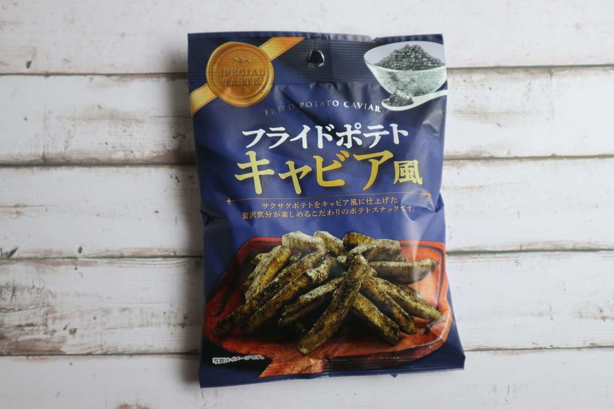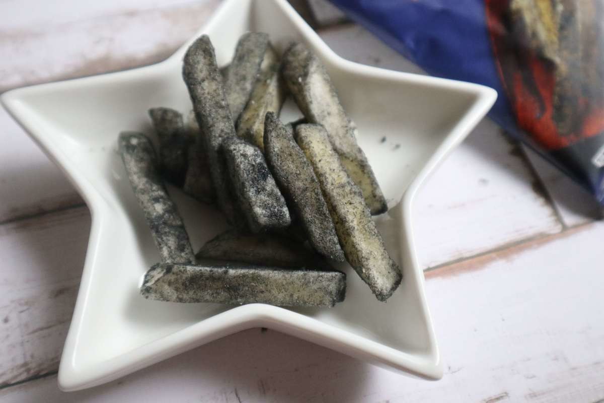 フライドポテトスナックに、キャビア風のシーズニングがまぶされて真っ黒!