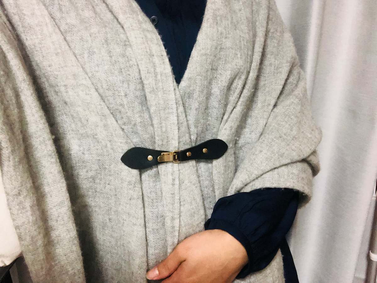 ストールで形を作ってからこのクリップで止めるだけ。前が開かないので、風も通さず両手が使えてとても便利!