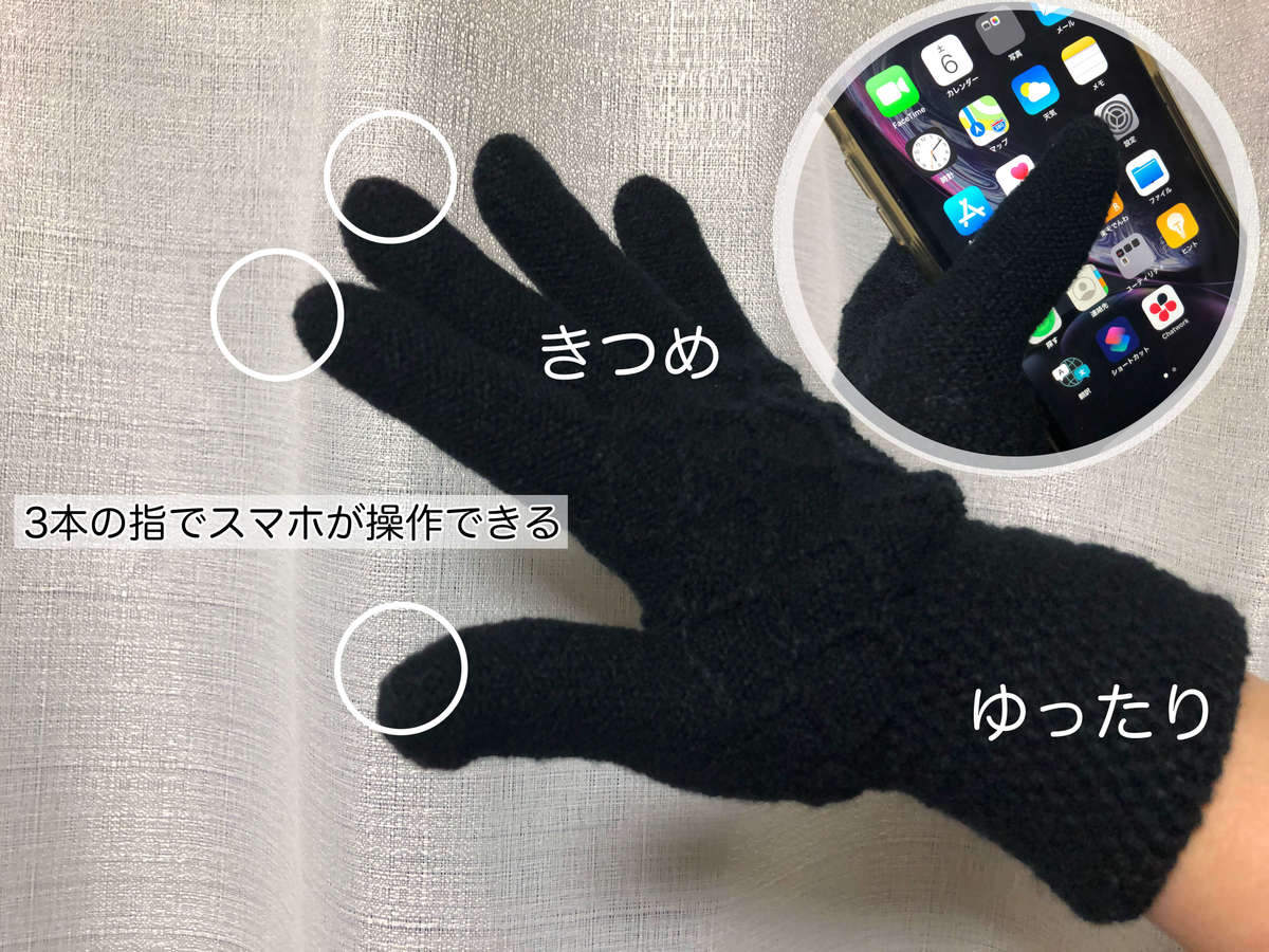 スマホは親指、人差し指、中指の合計3本で操作できます。ストレッチ素材でピッタリ手に馴染んでくれるので、スマホを触る時も指先が使いやすくてとても快適。
