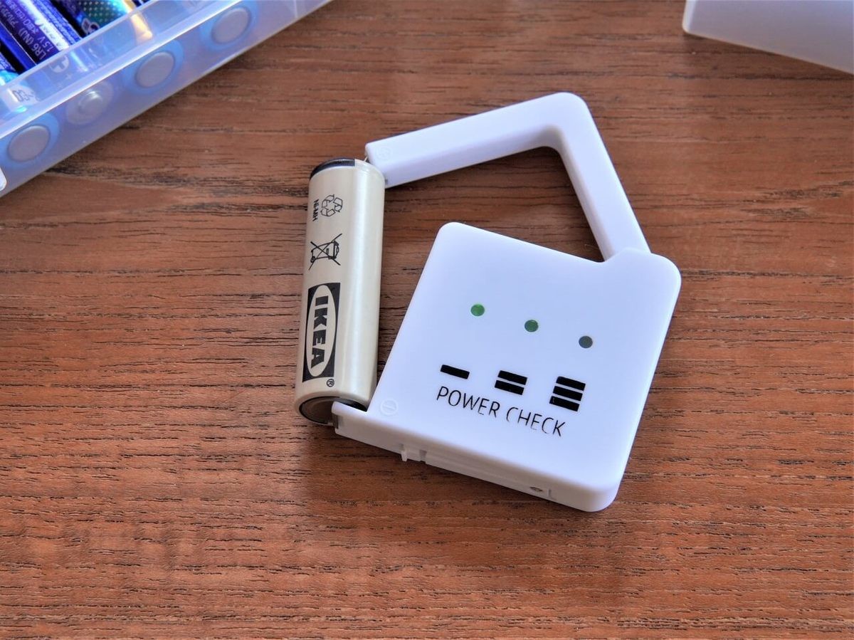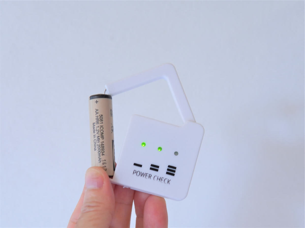 パワーチェックに電池を挟むと、電池残量を3段階でLED点灯で測定してくれます。