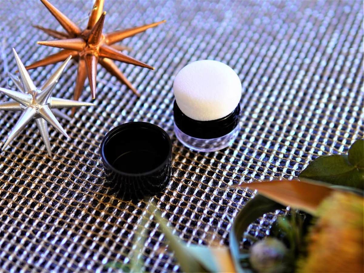 容器にパウダーを入れる時は、パフが付属されているプラスチックを引き上げて開けます。