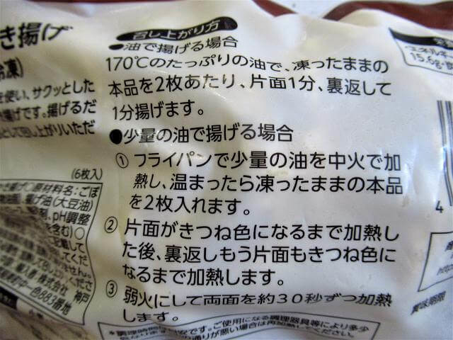 パケ裏情報では「170℃の油で2枚あたり片面1分、裏返して1分揚げる」とありますが、実際には衣がカリッとなるまでに片面2分ほど揚げました。