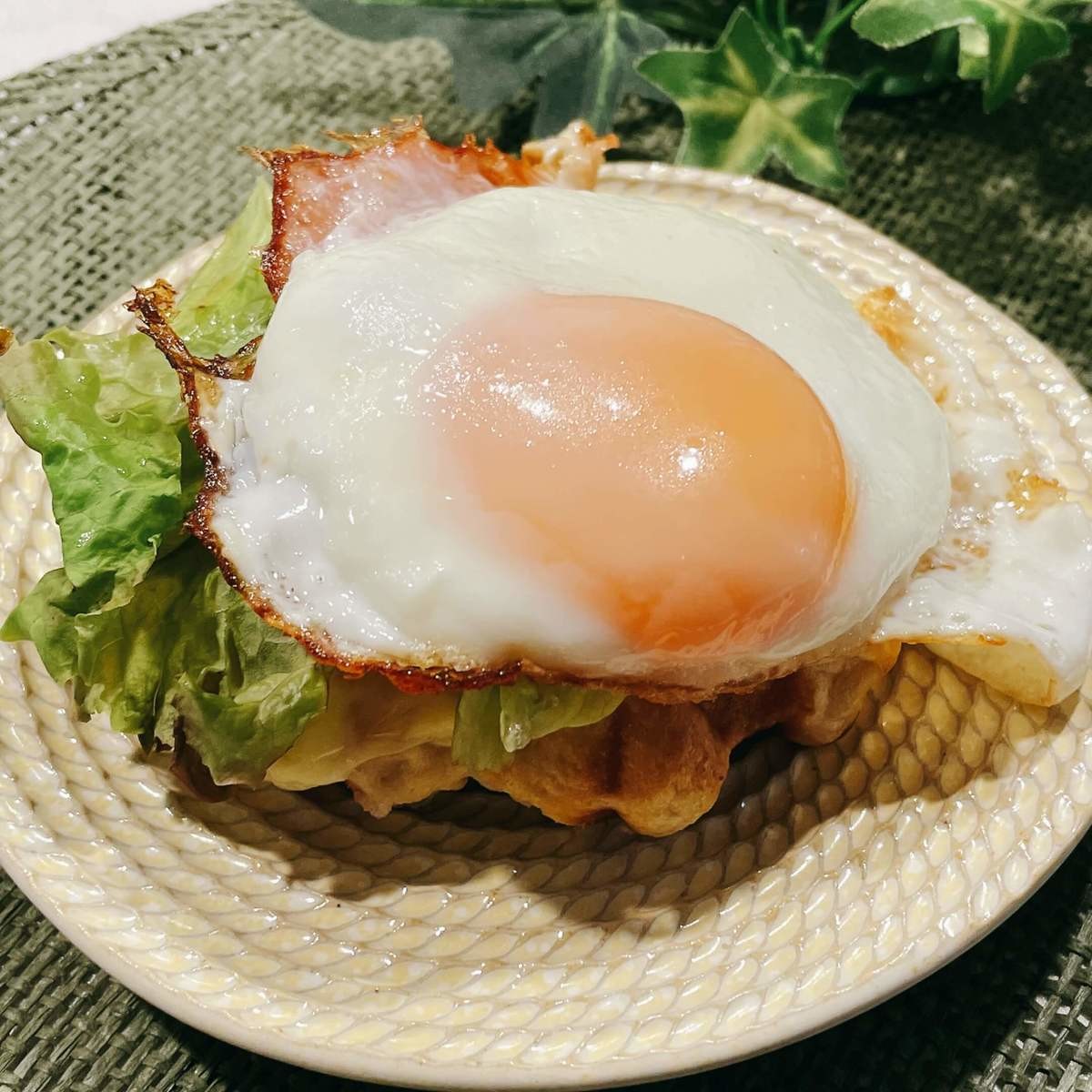 チーズをのせたベルギーワッフルをオーブントースターで焼き、レタスとハムエッグをのせたら完成です!
