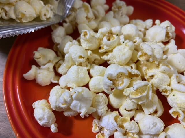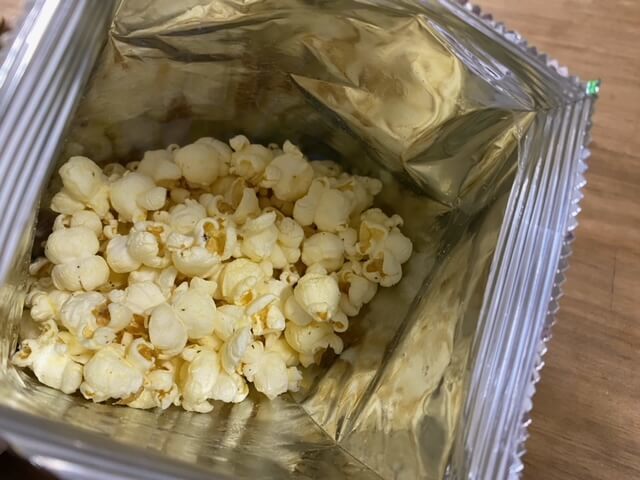 コーンポタージュ味のお菓子は袋を開けたら、香りが広がるのを想像しますが、こちらのポップコーンはそれほど香りがしません。