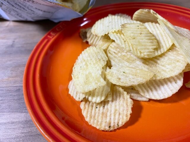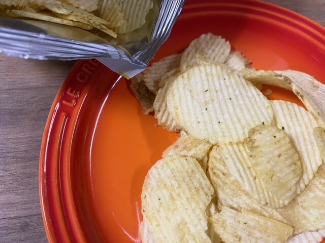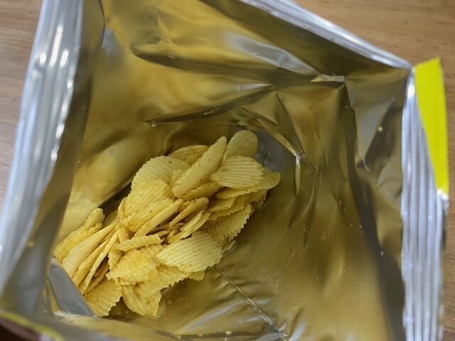 チップスはジャガイモをそのまま切って揚げたタイプではなく、ギザギザとした厚切りタイプです。