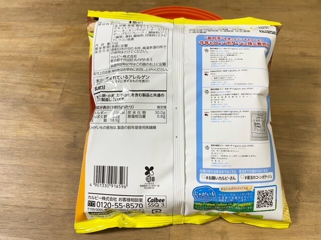 少し残念なのが、すぐに食べ終わってしまうこと!同じサイズの違う味のポテチは60gなのに対してコンポタ味は55g。