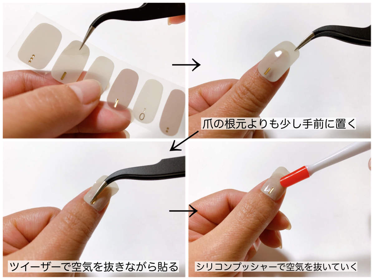 ツイーザーでシールを剥がし、爪の根元に沿って仮置きします。根元から端にかけて滑らしながら空気を抜き、最後にシリコンプッシャーでシールと爪をしっかりと密着させます。
