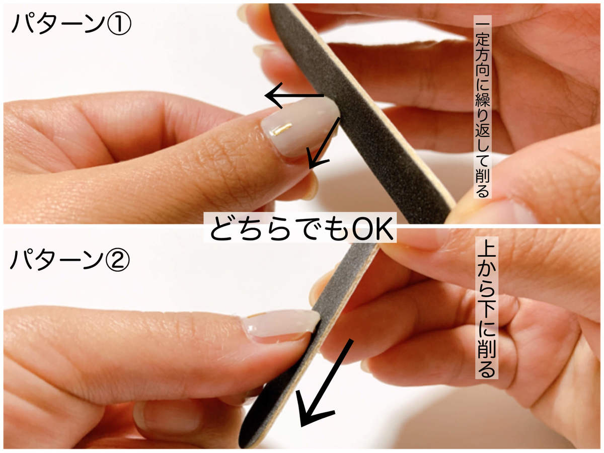 削る時のファイルの角度は、起こした状態にして爪の断面まで覆わないようにして削ってください。