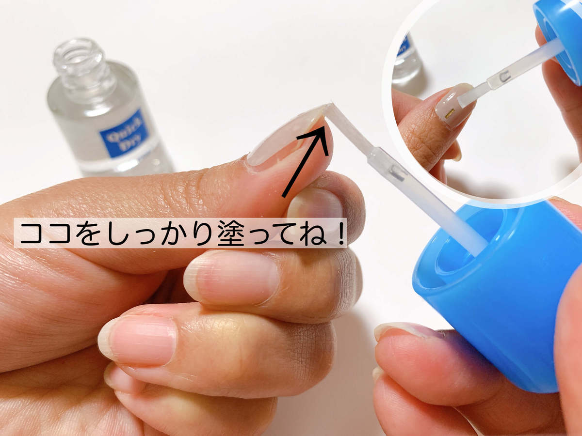 最後に、トップコートで全体をコーティングします。爪先は特にしっかりと塗りましょう!