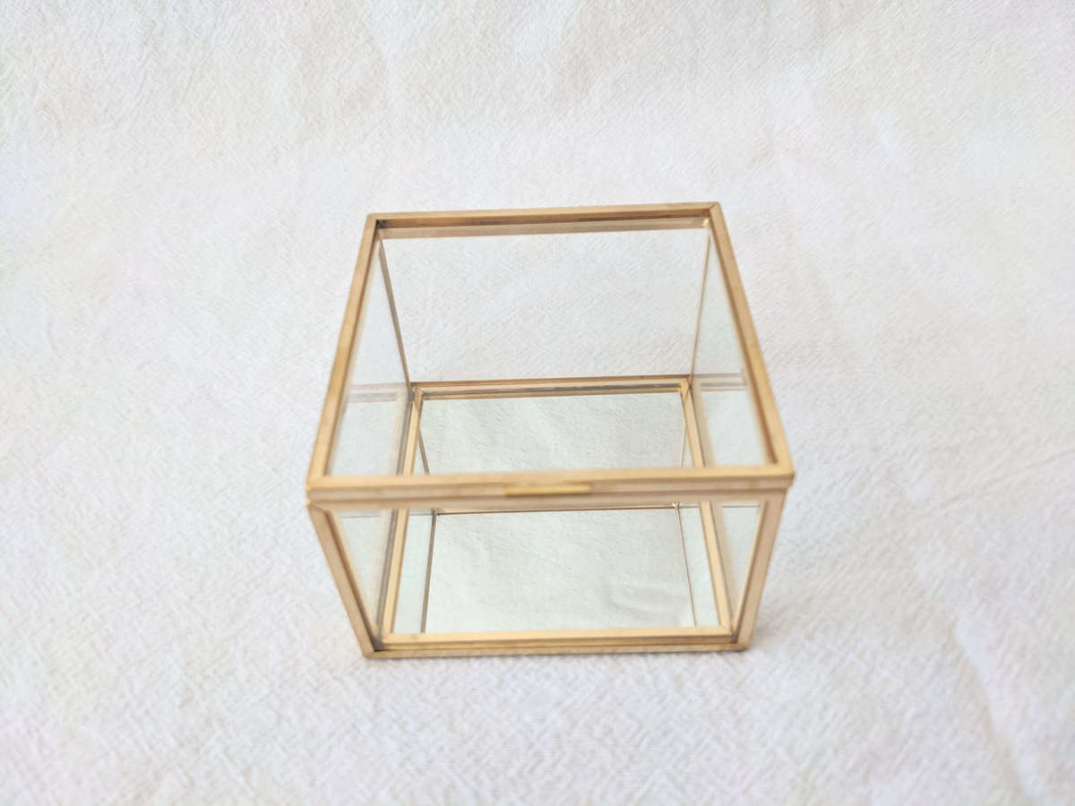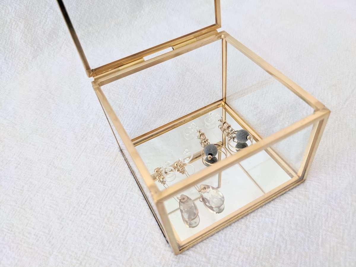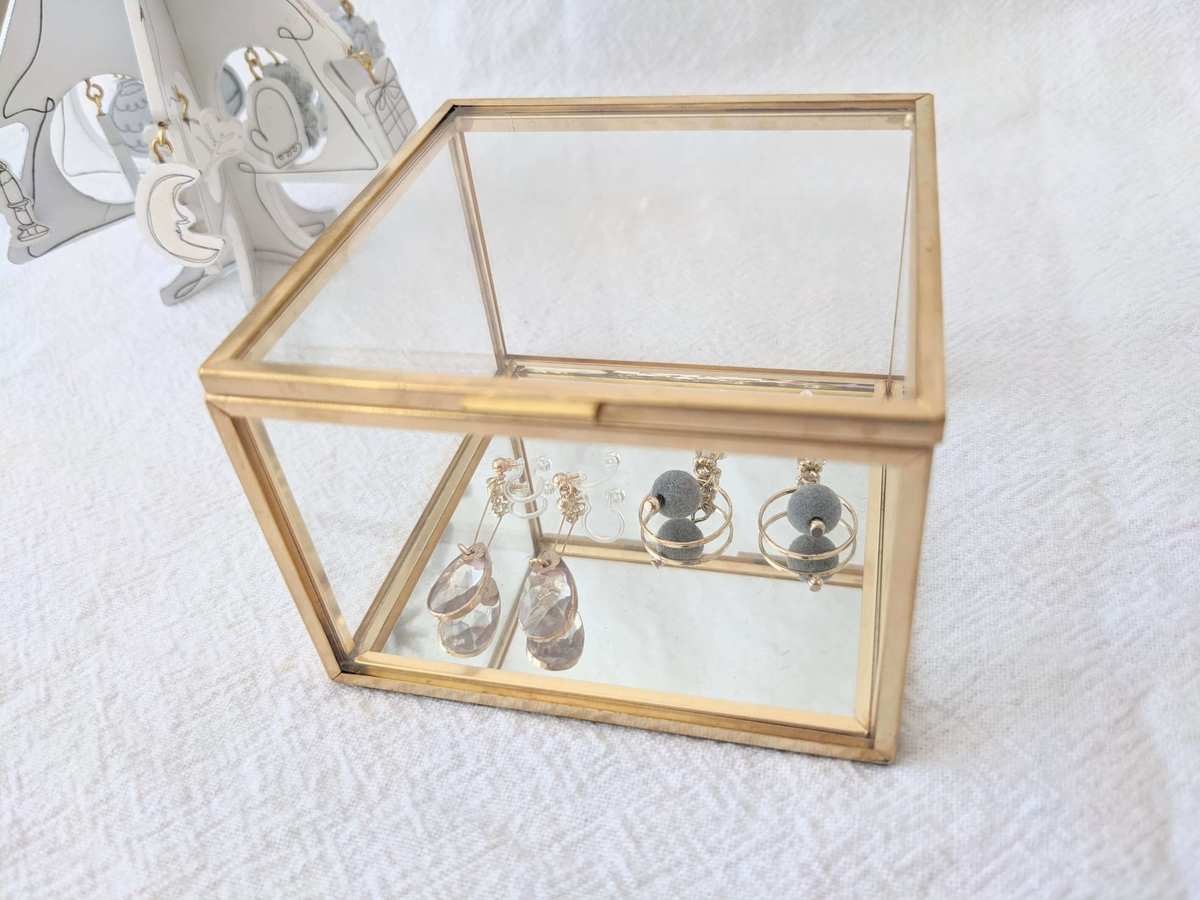アクセサリーや小物の魅力をより際立たせてくれる「フタ付きガラスケース」。 こちらはスモールサイズで、大きさは約幅8.5cm×奥行き8.5cm×高さ6cm。
