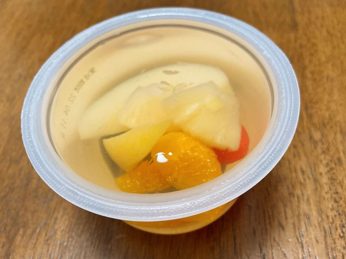 特に甘すぎることもなくごくごく普通のフルーツゼリーの味です。ゼリー部分も固すぎず柔らかすぎずちょうどよい具合で、スプーンですくいやすく喉越しもいいですね。