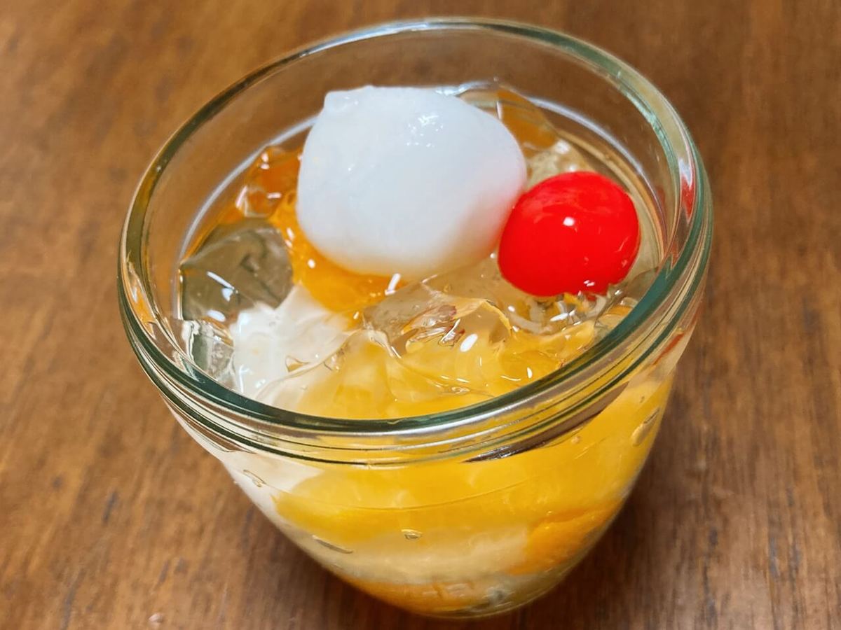 シロップ漬けのフルーツがいっぱい入ったスペシャル感のあるゼリーです。