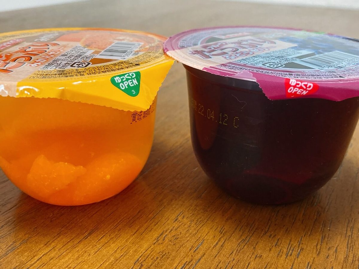 ぶどう以外の3種は大胆にゴロっとフルーツが投入されているようですが、ぶどうゼリーだけは外側から見ると闇……でイマイチどんな感じでフルーツが入っているかわかりません(笑)。