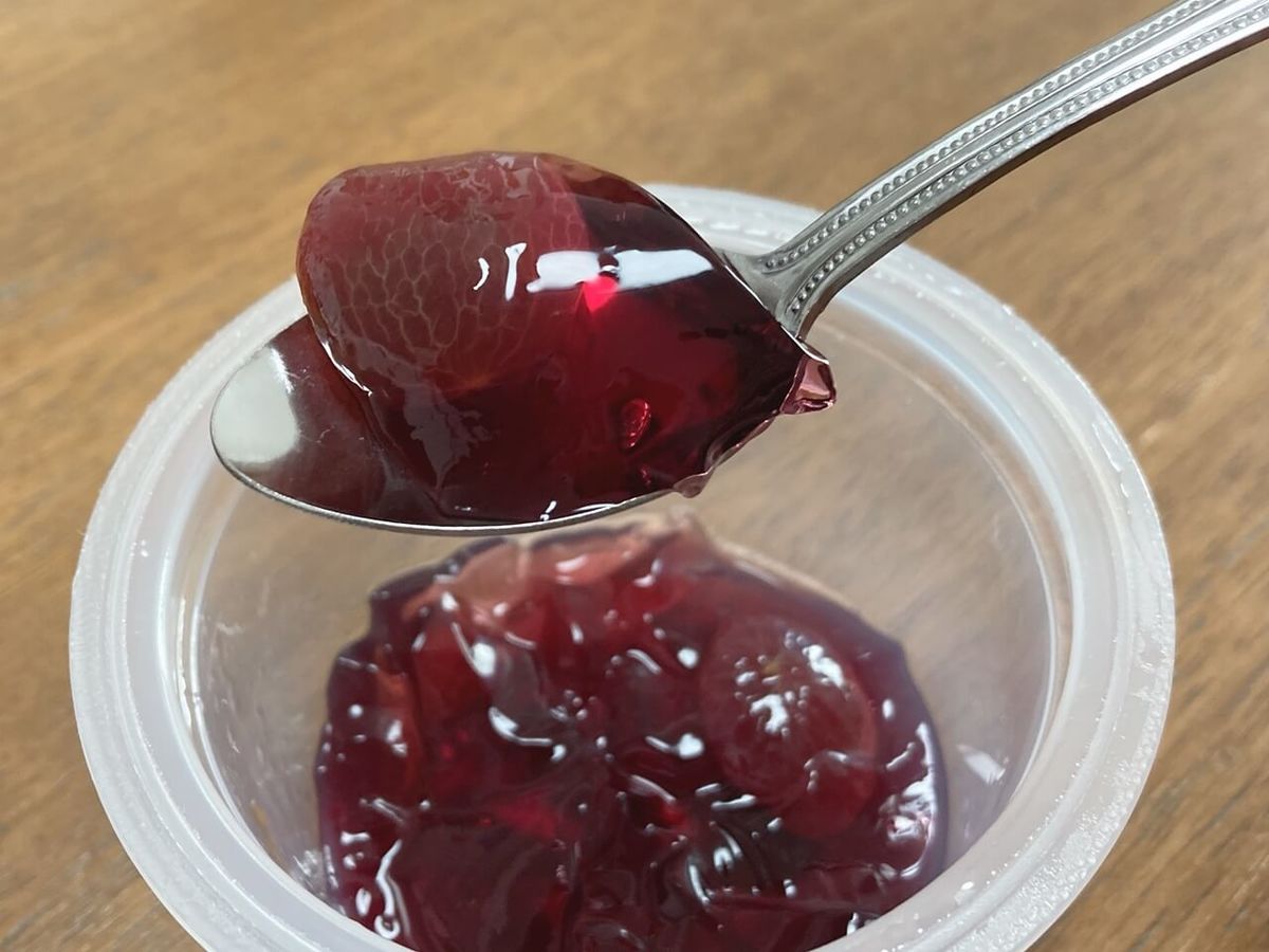 残念ながら、底のほうに3粒ほどのぶどうのシロップ漬けが入っているだけ。それ以外はぶどうゼリーでした。