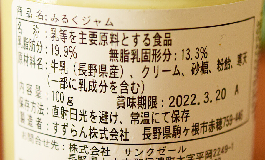 長野県駒ヶ根高原の酪農家で採れた新鮮な牛乳「すずらん牛乳」を使った、濃厚ながらもまろやかさがウリなジャムです。製造者を確認すると長野県駒ケ根市にある「すずらん株式会社」。