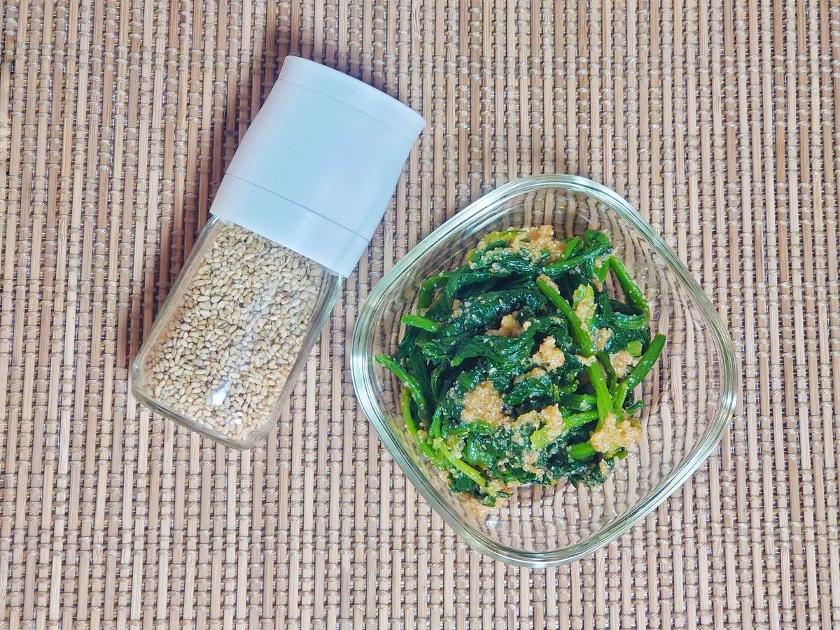 ごま料理でおすすめは、ごまよごし。すりごまに味噌とみりんとしょう油、砂糖を適量足してごま味噌を作り、そこにゆでたほうれん草を和えるだけと、とっても簡単です。