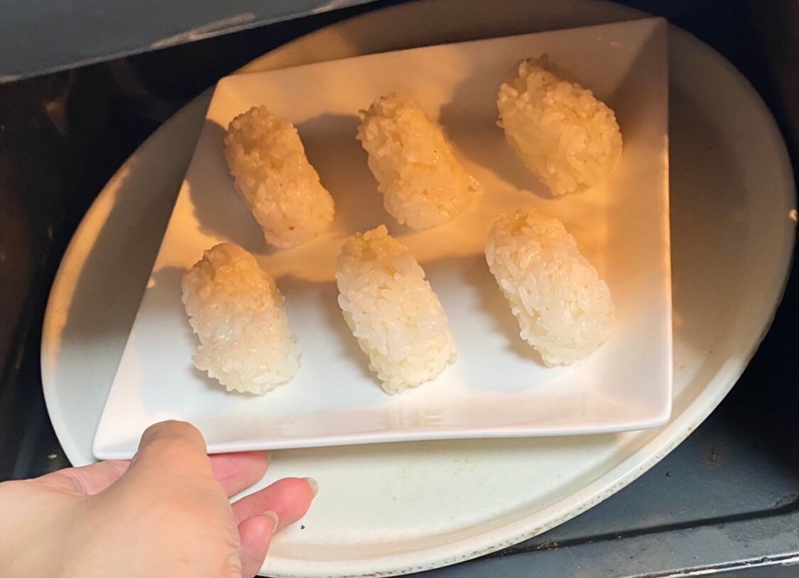 ネタを外したシャリを耐熱皿にのせて、ラップを掛けずにレンジでチン。