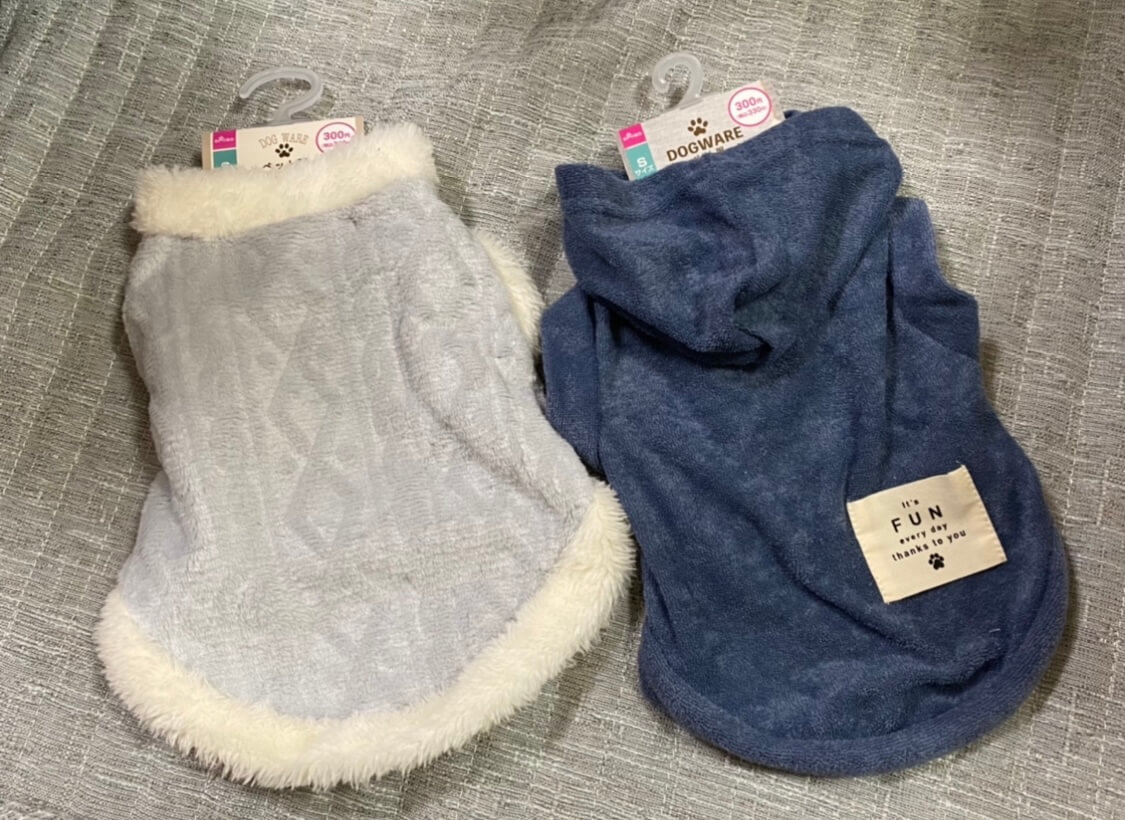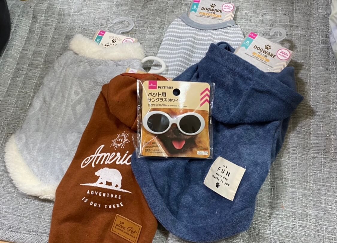 ダイソーのペットコーナーでゲットしたアイテムたちが、こちら!「DOGWEAR(330円 税込)」の種類の豊富さに驚いてしまいました。