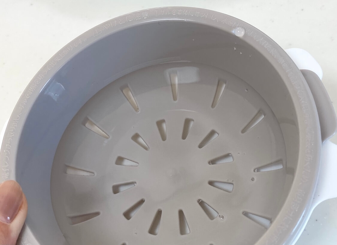 この二つのボウルを重ねて、グレーのボウルに書いてある線まで水を入れていきます。