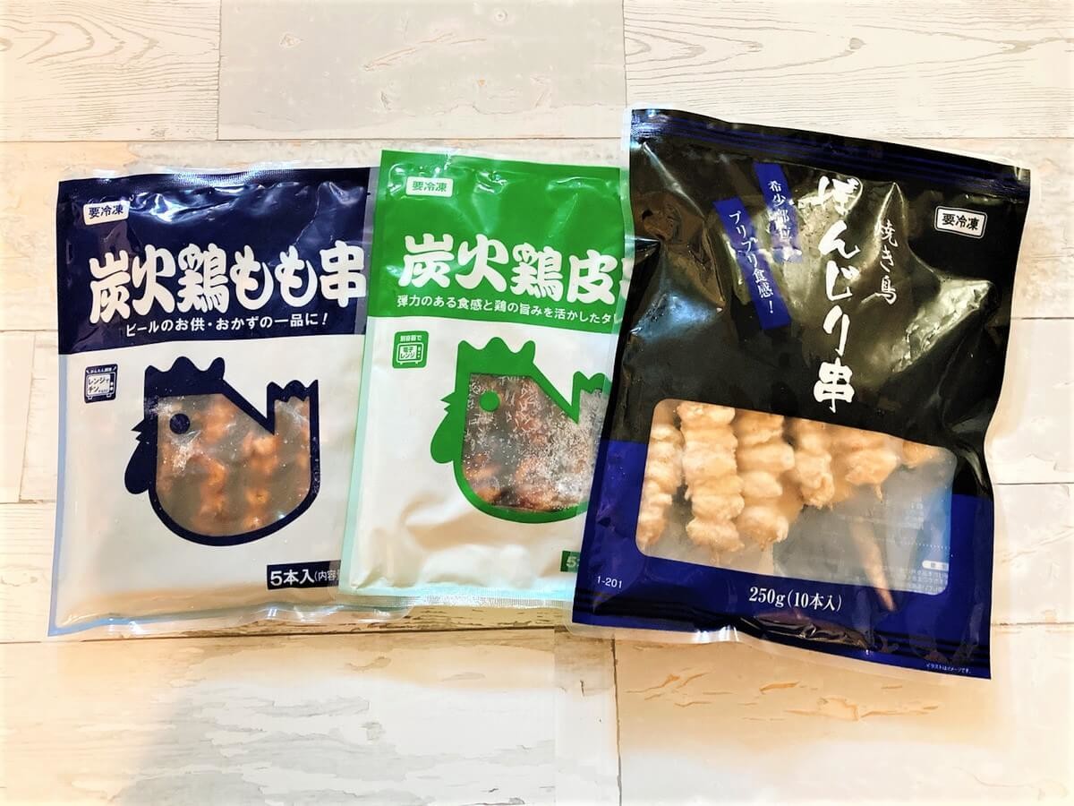 気軽に外食ができないコロナ禍で、業務スーパーの冷凍焼き鳥には何度もお世話になりました(笑) 50本入りの冷凍焼き鳥も高コスパですが、5~10本入りの焼き鳥はかさばらないので買いやすいんです。 今回買ってきたのは、「炭火鶏もも串」「炭火鶏皮串」「ぼんじり串」の3品。 3品合わせても、合計金額は669円!焼き鳥が20本も食べられて、700円以下ってすごすぎます…。 「炭火鶏もも串」「炭火鶏皮串」の2種は、電子レンジで調理できるうえにタレ付き! タレごと煮込んでたまごで閉じれば、簡単に親子丼が作れます。