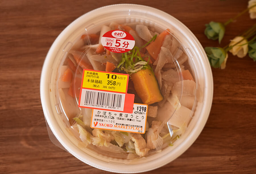 こちらも10%割引シールで358円(税込)で購入したヤオコー「かぼちゃ煮ほうとう」。ほうとうも電子レンジ調理で完成するなんて嬉しいですよね。