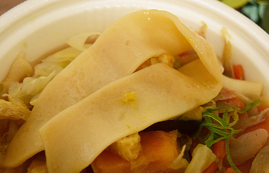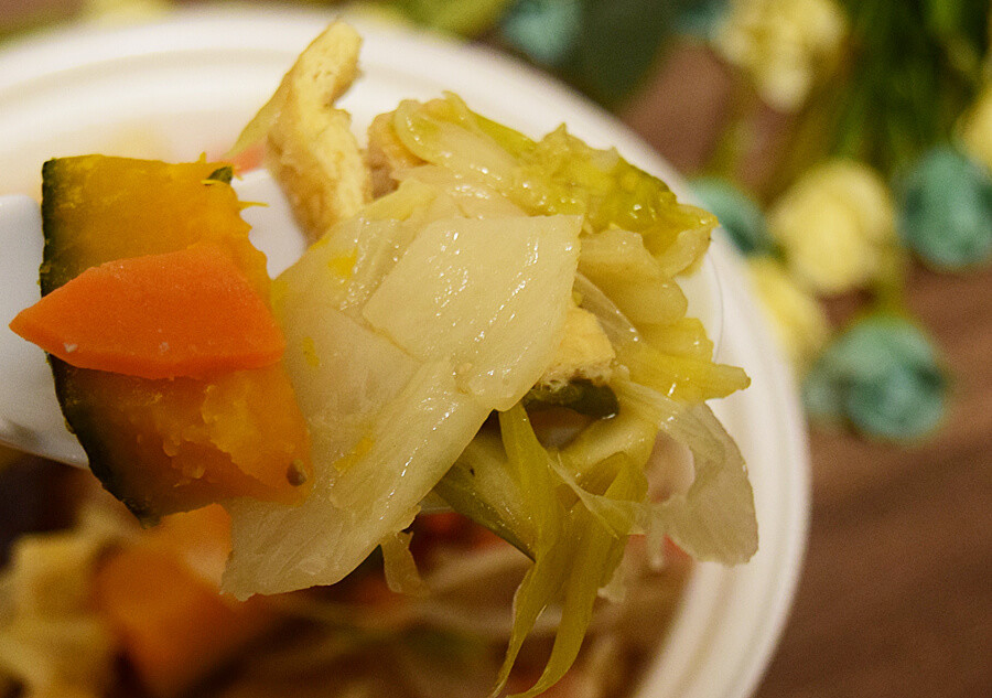 野菜がドサドサ入り過ぎていて、ほうとうがみえません。感覚としては、前述のタンメンと同じ位の野菜が入っている気がしますね。積極的に野菜を摂取したい時にはありがたい一品です。