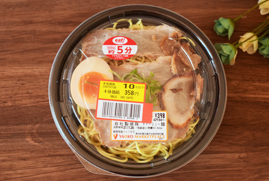 割引シールで386円(税込)で購入できた、ヤオコー「自社製焼豚 チャーシュー麺」。ヤオコーオリジナルの焼豚が入っています。ふたを外して電子レンジで5分(500W)加熱するだけで完成しますよ。