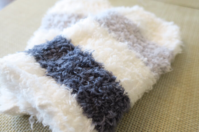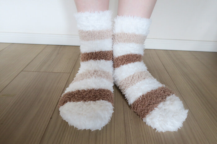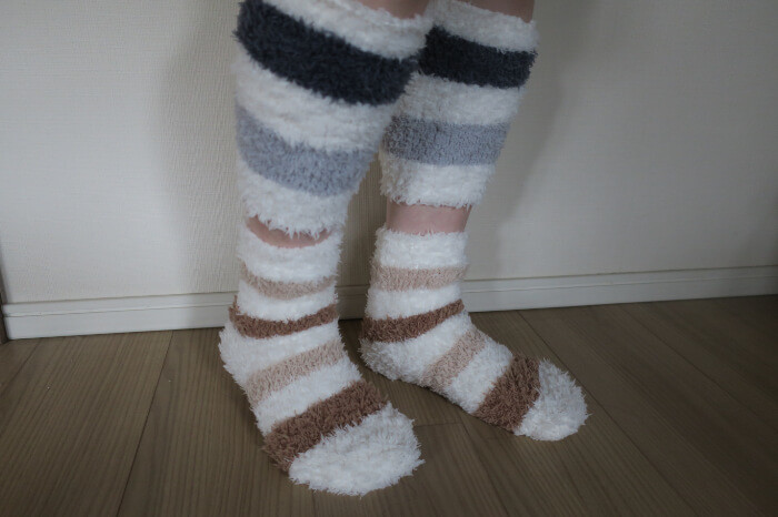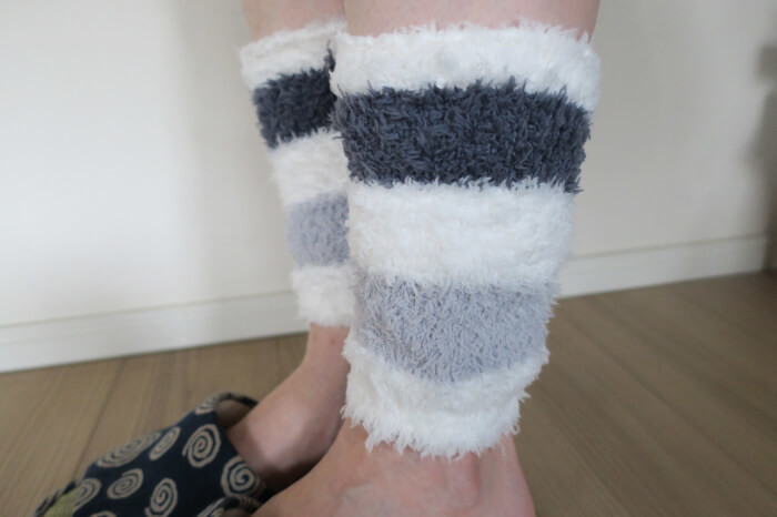 ふわふわでかわいいですよね。裏側も同じ素材なので、肌触りも気持ちいい! ちょっと短めで、足首に併せてふくらはぎの下くらいまでを覆ってくれます。よく伸びるので締め付け感もゼロ。