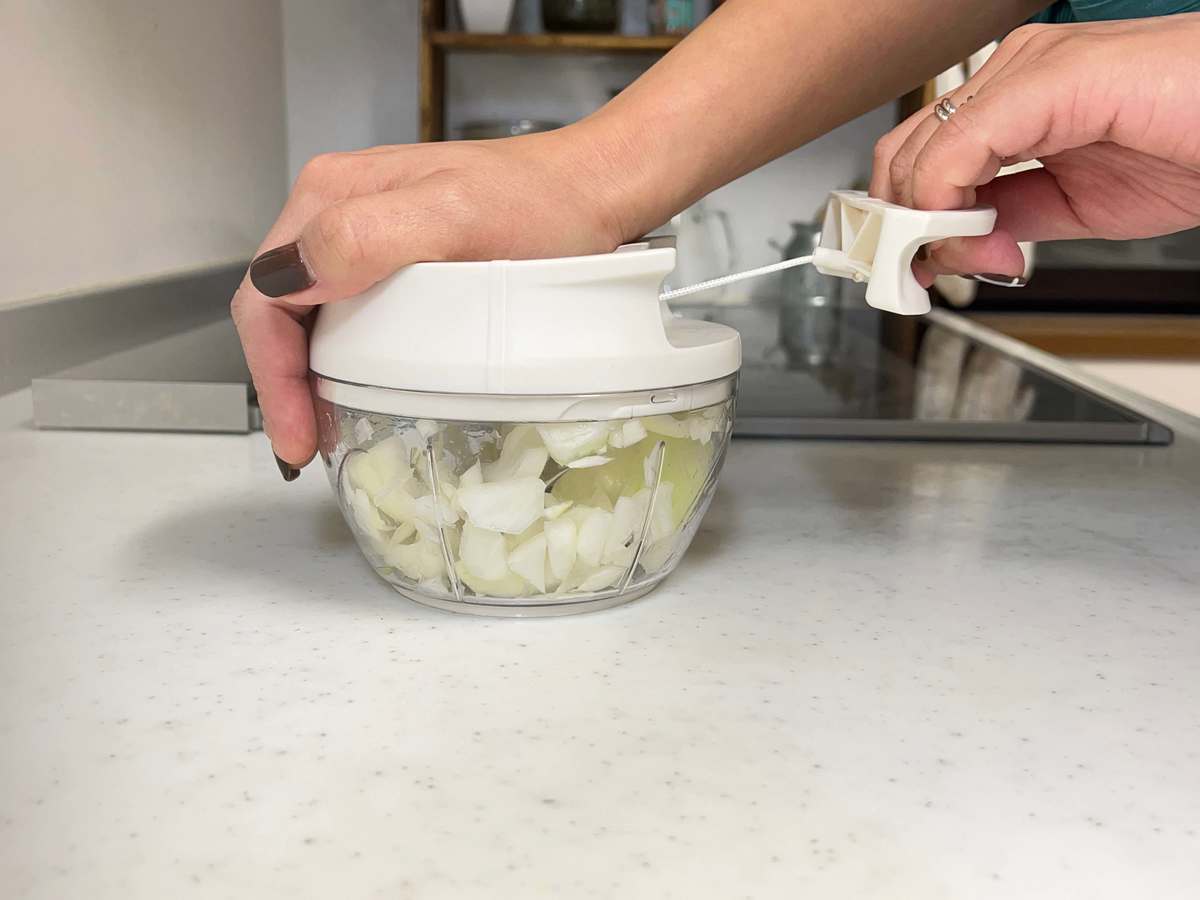 付属の刃をセットしたボウルに、一口大に切った野菜を入れて、フタをします。フタを軽く抑えながらハンドルを引っ張れば、あっという間にみじん切りの完成です。