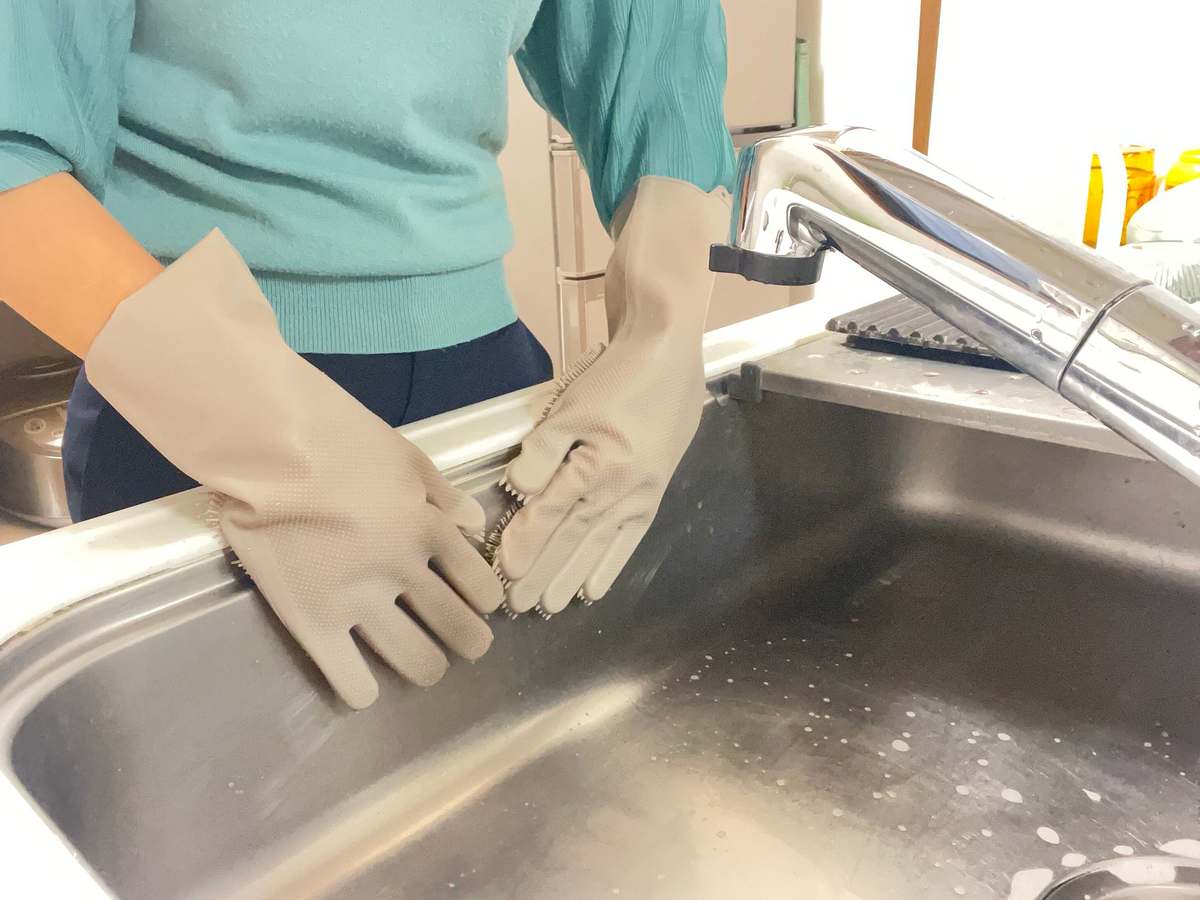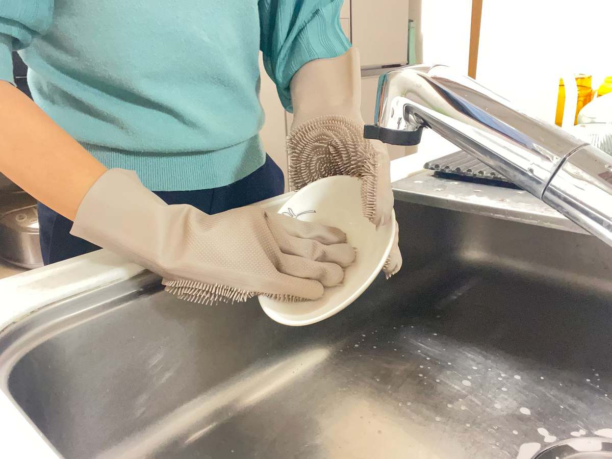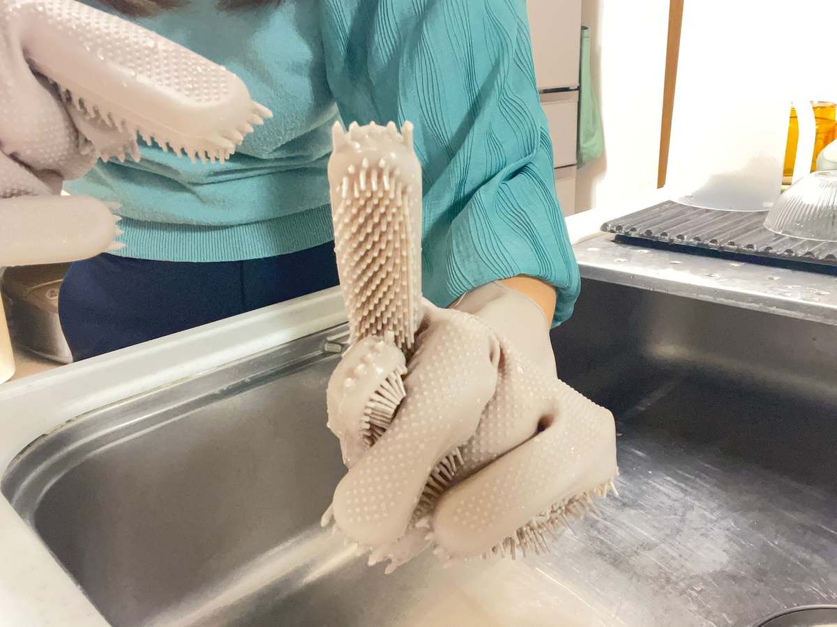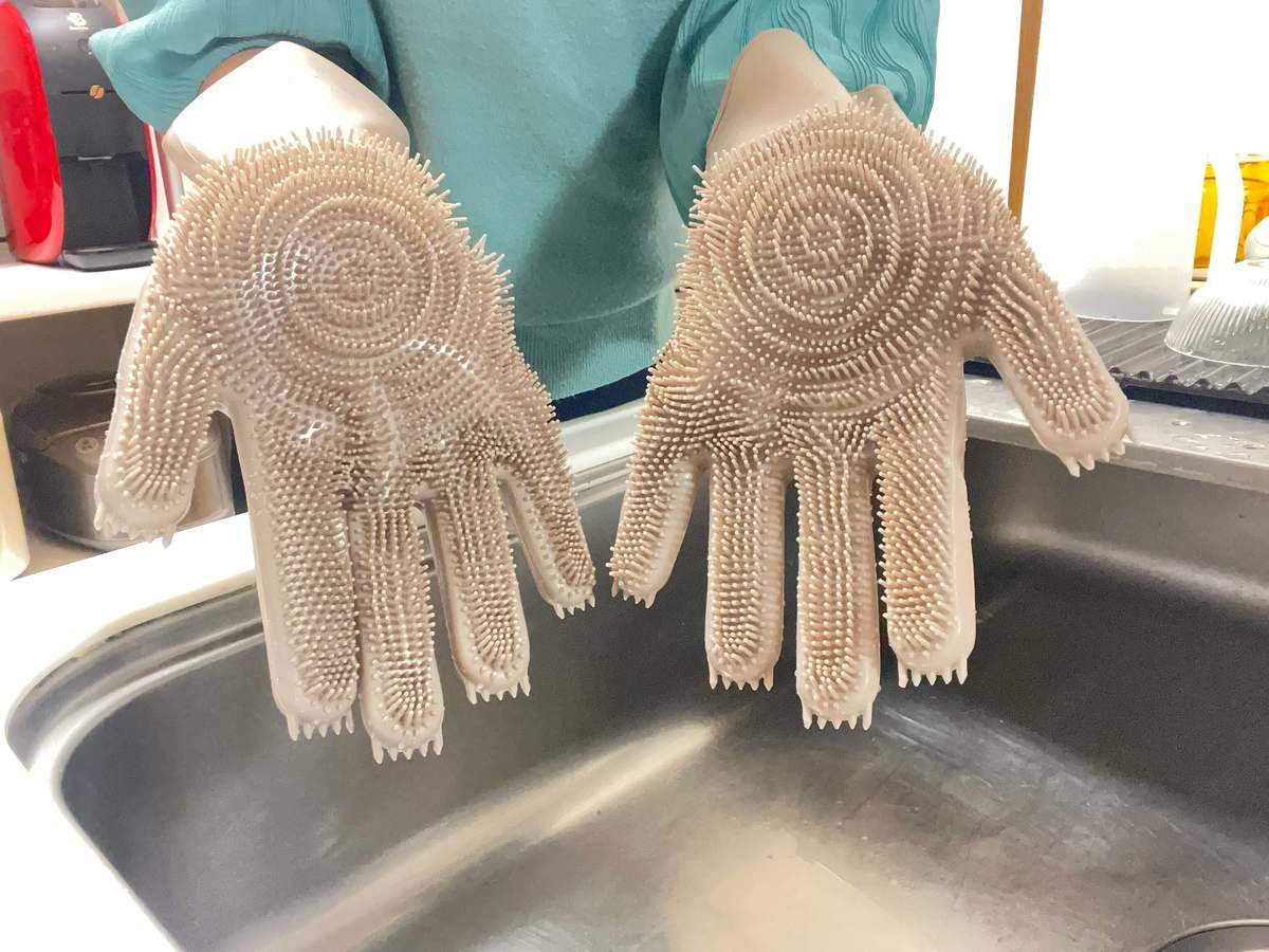 この手袋をつけて、食器を洗うとあっという間に油汚れも落とせて便利ですよ。