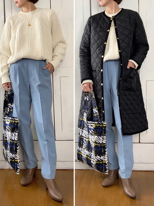 低めのハイネックスタイルなので、首が苦しくないのもポイント。1枚で着るのはもちろん、写真右側のようにノーカラーのアウターと合わせて着るのにもぴったりなニットです。