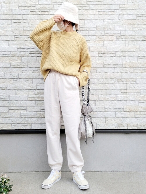 チャンキーニットでゆるっと着こなす淡色コーデ