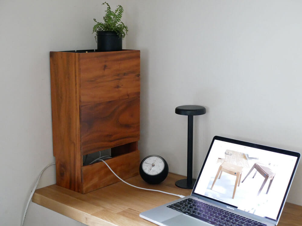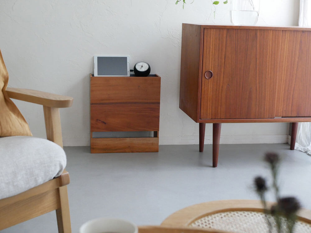 柔らかく自由奔放な木目のマホガニー材を採用した「ケーブルBOX」は、リビングの隅に置いただけで家具としても成り立つほど。 わちゃわちゃしたコード類の気配すら感じさせません。