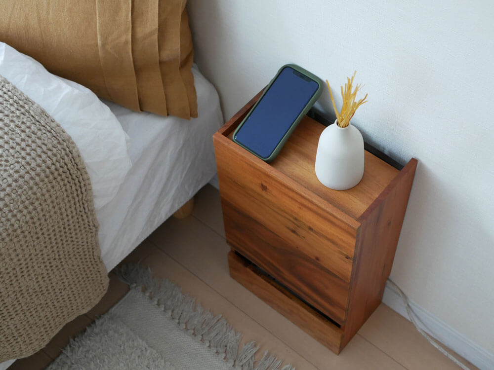 天板は小物類が置ける仕様になっているので、スマホやタブレット、時計や植物、ディフューザーなどプチディスプレイ棚としてもGOOD。