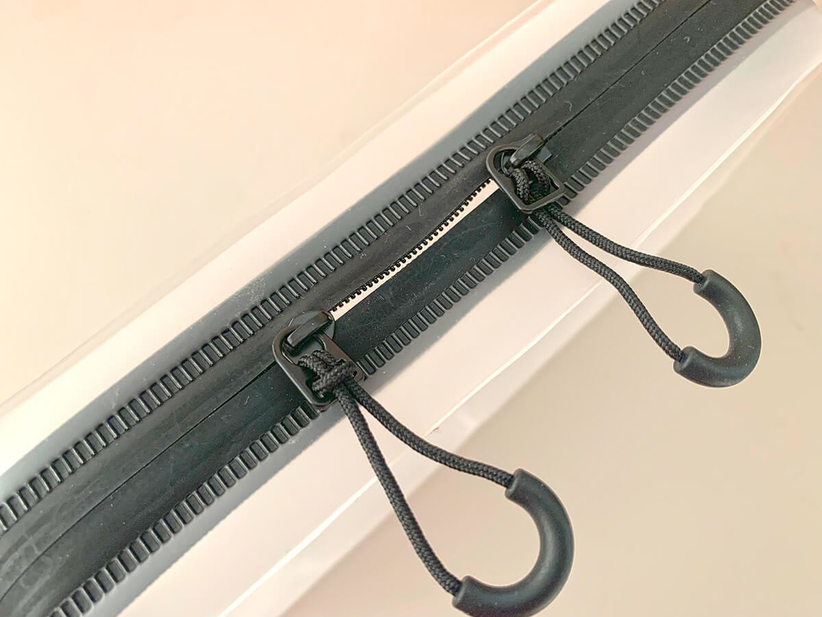 開閉はファスナー式ですが、ファスナー口が2つあるのが特徴で、それぞれに開閉がしやすいように紐状のフックが付いています。