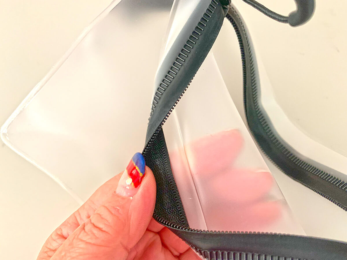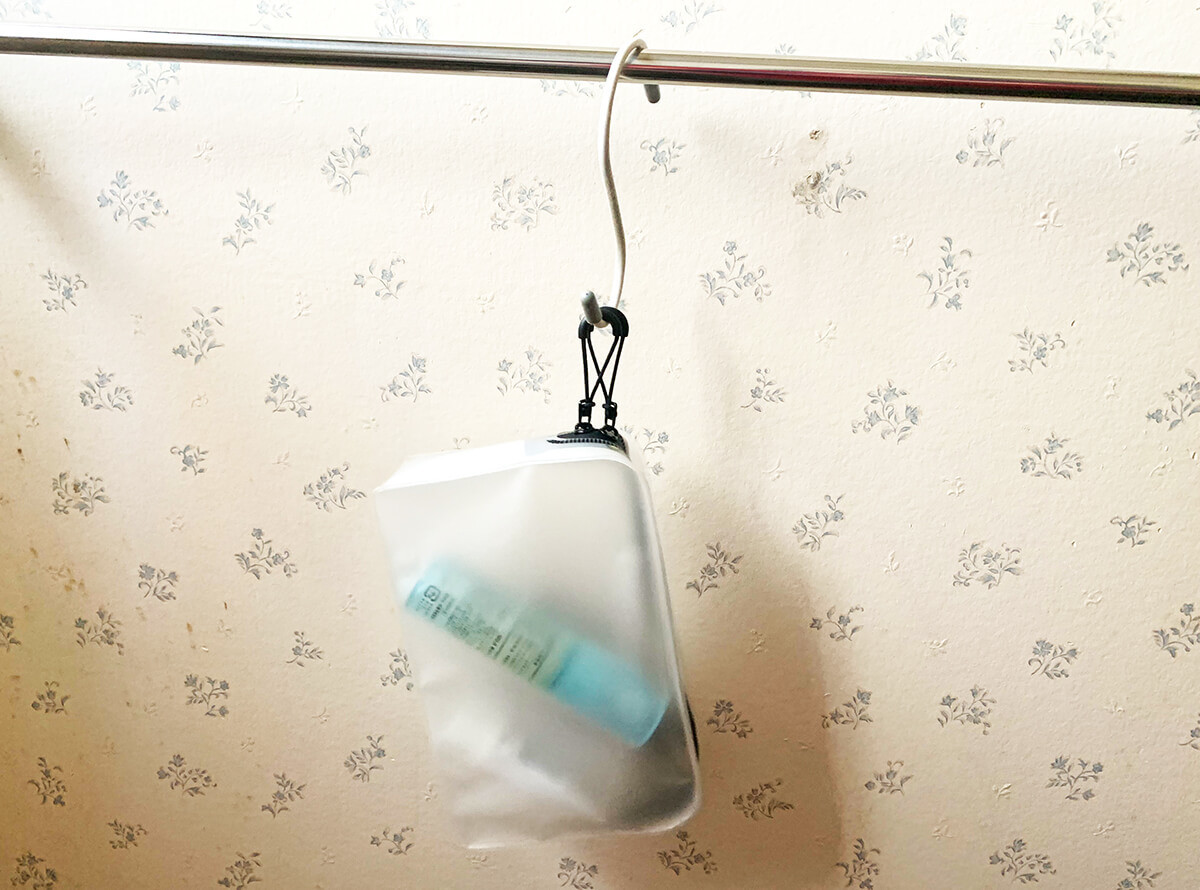 ファスナー部分には紐が付いているので、S字フックなどにかけることもできました。ただし!実際に中身を入れて吊るしてみて感じたのですが、中身が重いと破損の原因につながるように感じたので、中身を空けて乾燥させる時などに限定した方がいいかもと感じました。