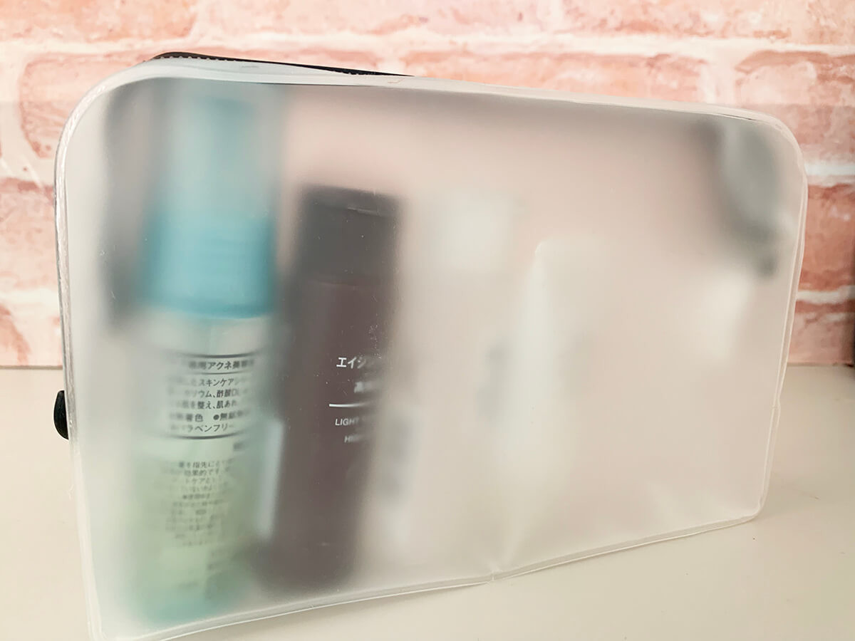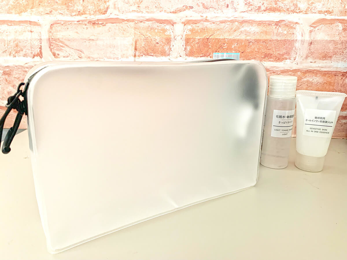 無印ファンなら、今や旅行時の携帯用の化粧品も無印で統一!という人も多いかもしれません。そこで実際に、無印の携帯用の化粧品を中に入れてみましたが、やはりサイズ感がぴったりでした。