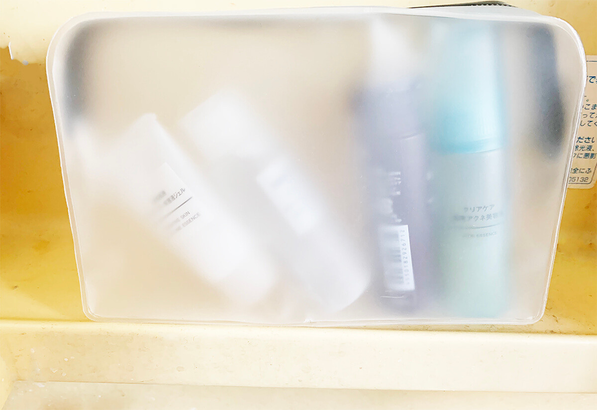 しかし自立するポーチの場合、洗面所の比較的衛生的な場所に、スペースを取らずに置けるため、容易に中の物を取り出すことができます。